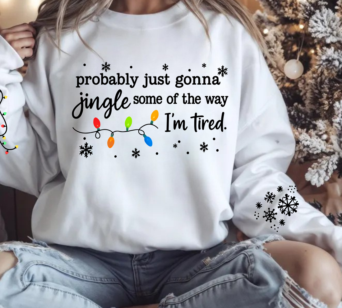 "Probably Just Gonna Jingle Some of the Way I'm Tired" Holiday Sweatshirt with Christmas Lights & Snowflakes