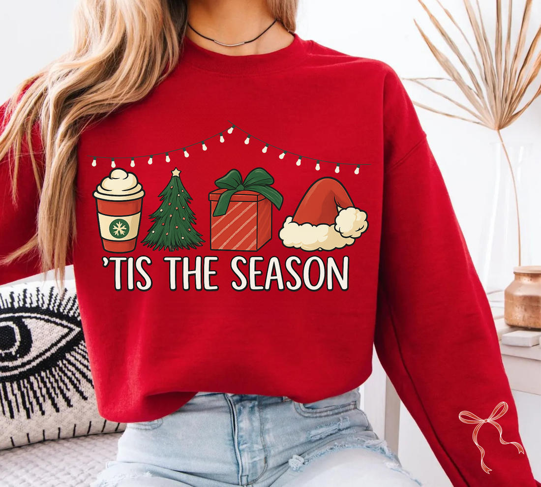 'Tis the Season Holiday Graphic (coffee, tree, gift, Santa hat)Crewneck Sweatshirt